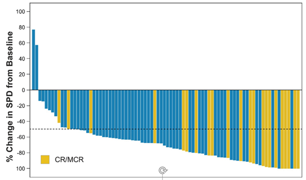 Responses were first observed in the first two cycles of therapy in 87.5% of all response (N=56), and 75% of all CRs (N=24) were observed in the first four cycles. The disease control rate (CR+PR+SD) was 85%. As of the data cutoff date, the data are not sufficiently mature to accurately estimate the final DOR in the PEP. An additional data cut is planned for approximately 14 months after the last patient in the PEP is enrolled to evaluate DOR and provide more mature safety results.