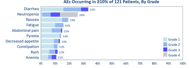 - With a median follow-up of 9.4 months (range 0.8-24) in the safety population of 121 pts, 9.9% (N=12) of patients had discontinued zandelisib due to any drug-related adverse event. Adverse events occurring in ≥ 10% of 121 patients regardless of relationship to zandelisib were: diarrhea, neutropenia, nausea, fatigue, abdominal pain, pyrexia, decreased appetite, constipation, rash and anemia.