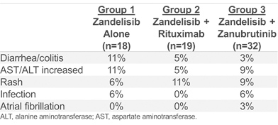 - With a median duration of drug exposure of 17.1 months in Group 1, 20.5 months in Group 2, and 7.1 months in Group 3, six patients (8.7%) discontinued therapy due to treatment related adverse events. Grade 3 AESI, ranging from 0% to 11% across all groups, were: diarrhea/colitis, AST/ALT increase, rash, infection and atrial fibrillation (with zanubrutinib only). No grade 4-5 adverse events of special interest were reported. One patient in Group 3 had reversible grade 4 drug rash with eosinophilia and systemic symptoms (DRESS) syndrome. Grade 3-4 neutropenia was observed in 11 pts (16%).