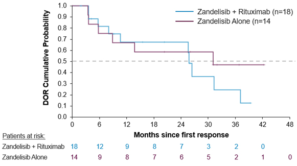 Zandelisib administration was continued until disease progression or intolerance. Patients received a median of 2 prior therapies and 65% were POD24.