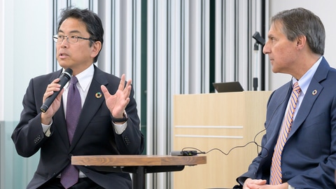 A commemorative presentation was held following the HB7 building completion ceremony and a facility tour. This report will present the content of the presentation in two parts. The first part of this report will cover a speech given by Mr. Naritaka Nakaishi, Director-General of the National Healthcare Policy Secretariat, Cabinet Office, Government of Japan (at the time) followed by a panel discussion about uniting talent at the Takasaki Plant and the new plant in Sanford.