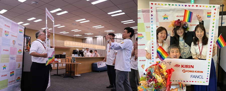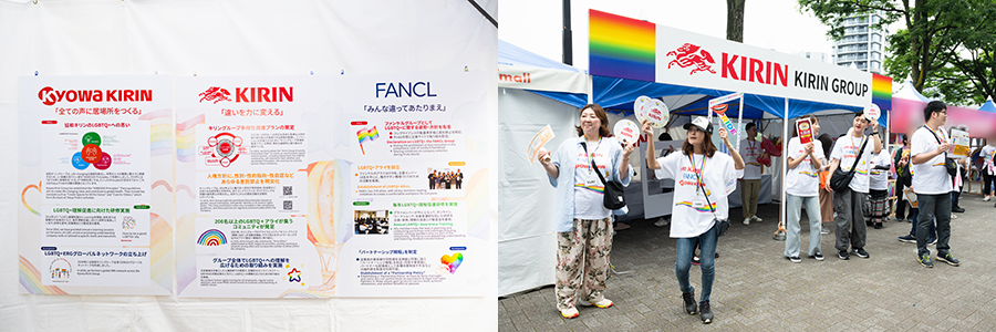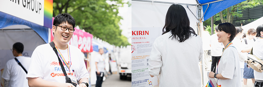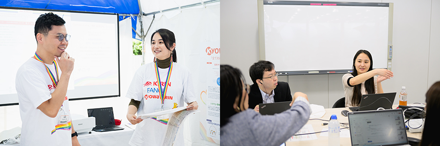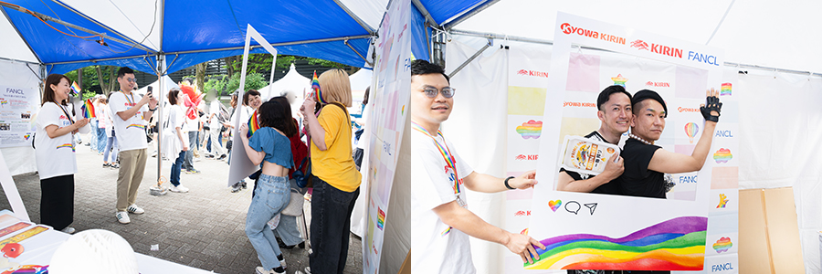 In 2025, aiming for deeper engagement, Kirin Holdings, FANCL, and Kyowa Kirin joined forces as ONE Kirin Group team to support employees and exhibit together at Tokyo Pride. Our three main objectives were: to express support for equal rights for all individuals; to communicate the Group’s shared respect for gender diversity, and to strengthen collaboration across company boundaries and foster awareness and inclusive culture among all employees.