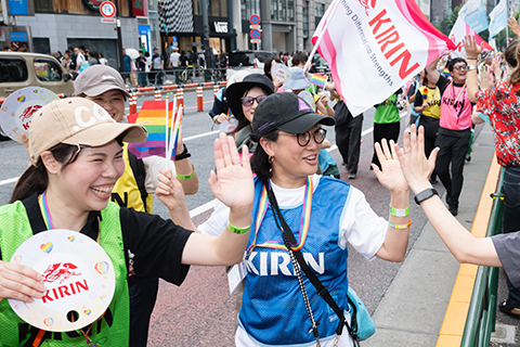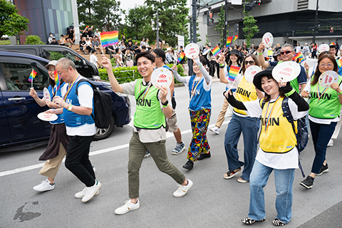 72 Kirin Group employees joined the parade, walking from Yoyogi Park through Shibuya and Harajuku. Participants included new employees, a reemployed retiree, and a parent with three children. Though strangers at first, the group quickly bonded, cheering “Happy Pride!” along the route.