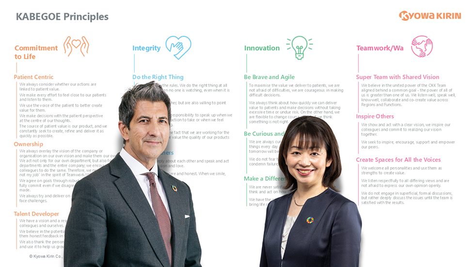 Itagaki The KABEGOE Principles outline how we at Kyowa Kirin work together, drive transformation, and collectively grow to achieve our vision and pursue further growth beyond it. There is a total of 11 principles, and by each of us embodying them continuously, we will shape and strengthen our KABEGOE Culture.